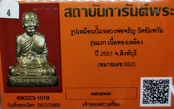 รูปเหมือนปั๊มพ่อจรัญ วัดอัมพวัน รุ่นแรก เนื้อทองเหลือง ปี2551 จ.สิงห์บุรี(หมายเลข552) + กล่องเดิม + บัตรG-pra สภาพสวยเดิมค่ะ สภาพตามรูปทุกประการค่ะ