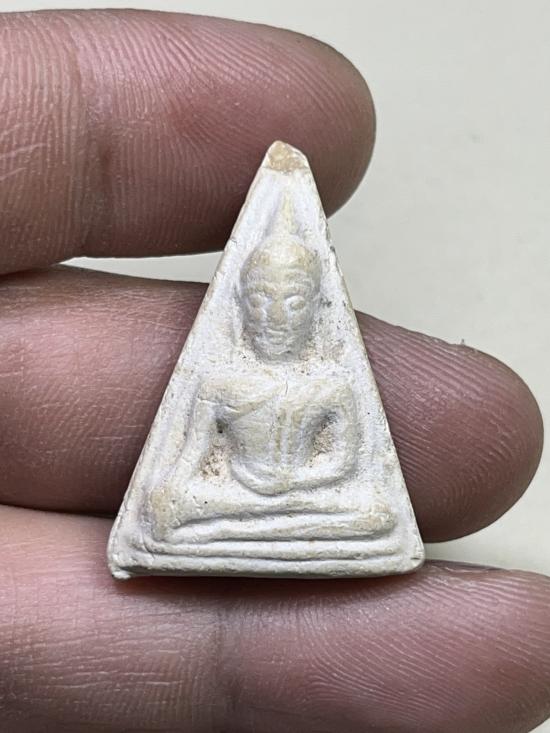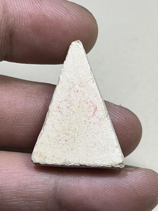 สมเด็จนางพญา เนื้อผงน้ำมัน หลังปั้มยันต์แดงจางๆ ไม่ทราบที่ มีบิ่นปลายยอด