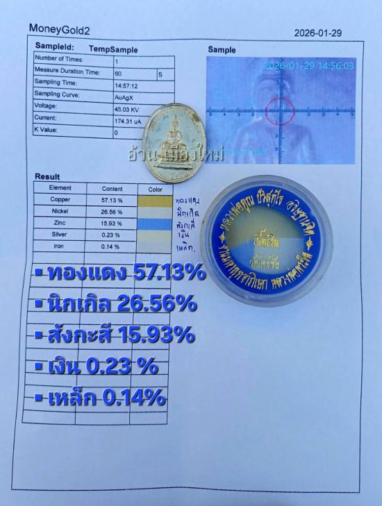 ++ตรวจเปอร์เซ็นโลหะ : ทองแดง 57.13% , นิกเกิล 26.56% , สังกะสี 15.93% , เงิน 0.23% , เหล็ก 0.14%