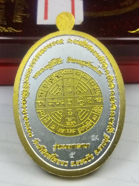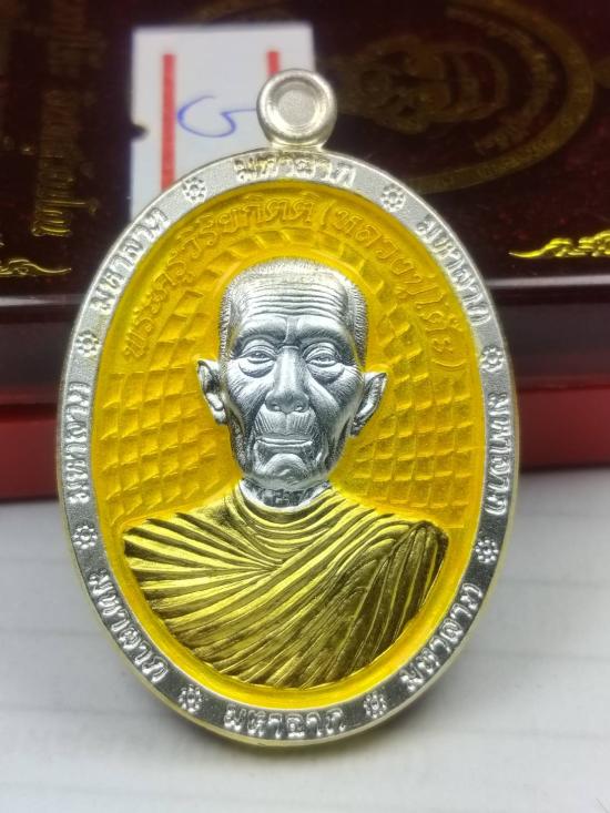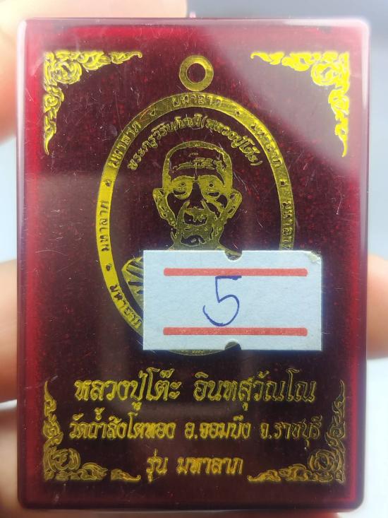 รุ่น มหาลาภ (หลวงปู่โต๊ะ วัดถ้ำสิงโตทอง จ.ราชบุรี) เนื้อ2K ลงยาพื้นเหลือง ลงยาจีวร หมายเลข ๕ กล่องเดิม (ขอบมหาลาภ) |