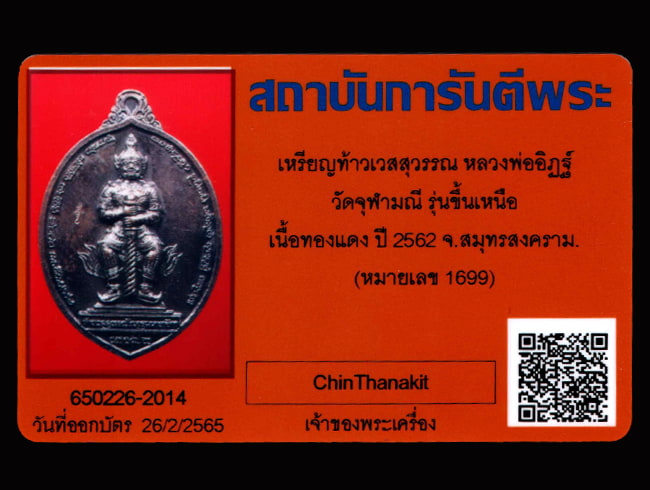 เหรียญท้าวเวสสุวรรณ วัดจุฬามณี รุ่น ขึ้นเหนือ เนื้อทองแดง (หมายเลข 1699) ปี2562 พร้อมบัตร QR-Code