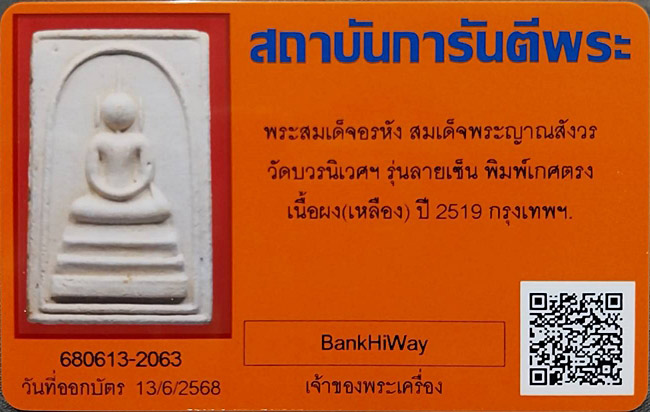 ด้านหลังองค์พระมีชื่อของเจ้าประคุณสมเด็จพระญาณสังวรและเส้นเกศาของท่านบรรจุอยู่