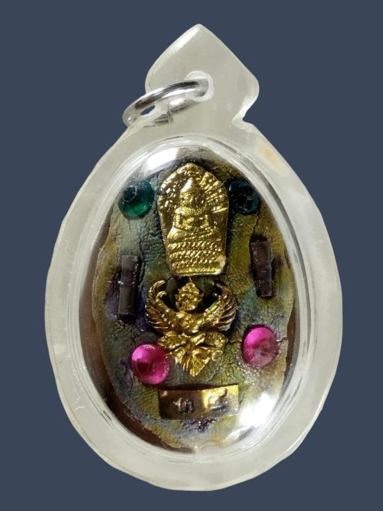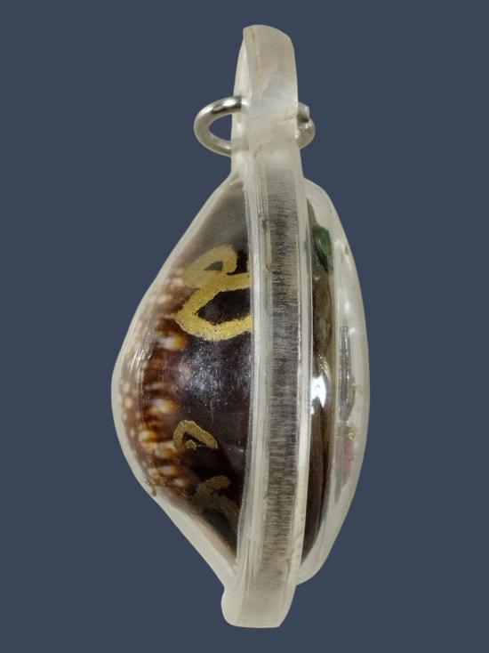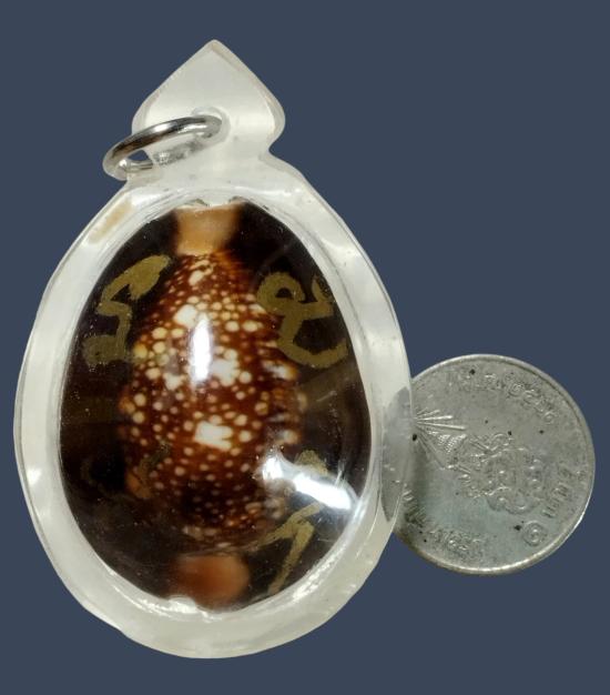 เบี้ยแก้มีจารปากกาสีทอง หลังติดผงฝังพลอย,ครุฑ,นาคปรก,ตะกรุด และมีเลขลำดับ ๓๔ เข้าเลี่ยมกันน้ำเรียบร้อย ปรอทวิ่งดีค่ะ