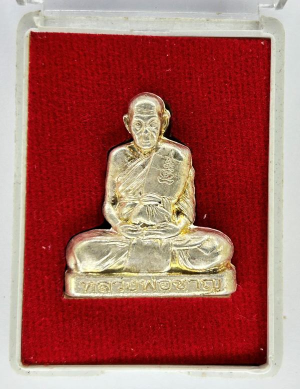 เนื้อเงิน รูปเหมือนปั้ม หลวงพ่อชาญ วัดบางบ่อ จ.สมุทรปราการ อุดกริ่งพิมพ์เข่ากว้างรุ่นแรก รุ่นสร้างกำแพง ปี58-59 กล่องเดิม