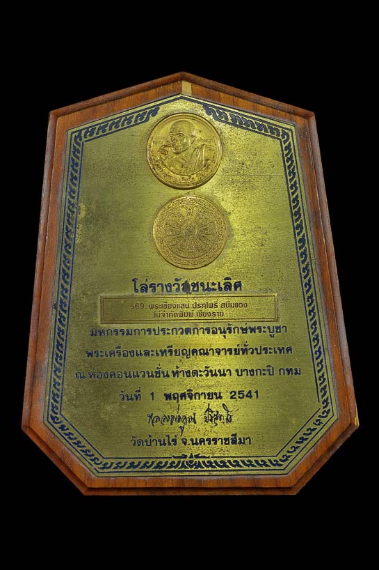 ++โล่รางวัลชนะเลิศ มหกรรมนิทรรศการการประกวดพระเครื่องพระบูชาเหรียญคณาจารย์ทั่วประเทศ 1 พฤศจิกายน พ.ศ.2541 ณ ห้อง คอนแวนชั่น ห้างตะวันนา บางกะปิ กทม.