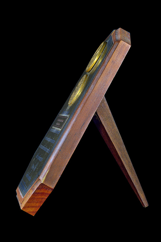 ++ขนาด 5 x 6 นิ้ว , แผ่นไม้มีขาตั้ง แผ่นทองเหลืองสกรีนตัวหนังสือสีน้ำเงิน , ติดเหรียญ หลวงพ่อคูณ รุ่น เฮงคูณเฮง 8 ทิศ พ.ศ.2536 และ ติดเหรียญธรรมจักร ( เนื้อกะไหล่ทอง )
