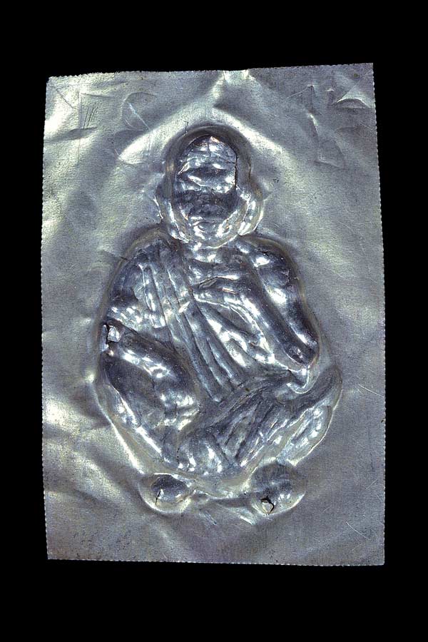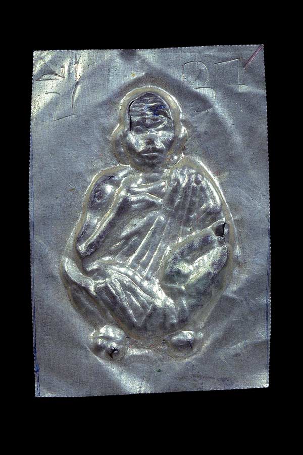 แผ่นปั๊มหน้ากากสี่เหลี่ยมรูปเหมือนนั่งยอง ( 2 X 2.7 ซม. ) รุ ่น โชคดีเด้อ ( เนื้อเงิน ) พ.ศ.2537