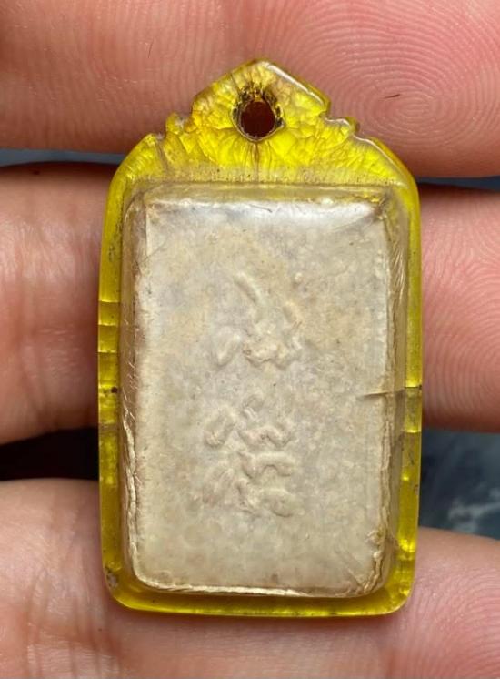 พระเนื้อผงรูปเหมือนเนื้อเก่า ด้านหลังมียันต์ พร้อมเลี่ยมห้อยใช้เก่าๆ มีคราบหิ้ง/ฝุ่นผงติด ไม่ทราบที่ครับ