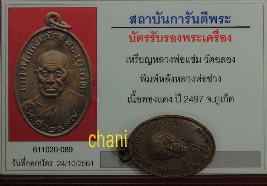 เหรียญ หลวงพ่อแช่ม วัดฉลอง พิมพ์หลังหลวงพ่อช่วง บล๊อกสี่แตร นิยม เนื้อทองแดง ปี2497 จ.ภูเก็ต สภาพสวยๆ มีผิวไฟงามๆเดิมๆ หายากมากสภาพนี้ พร้อมบัตรรับรองจากจีพระอุ่นใจได้