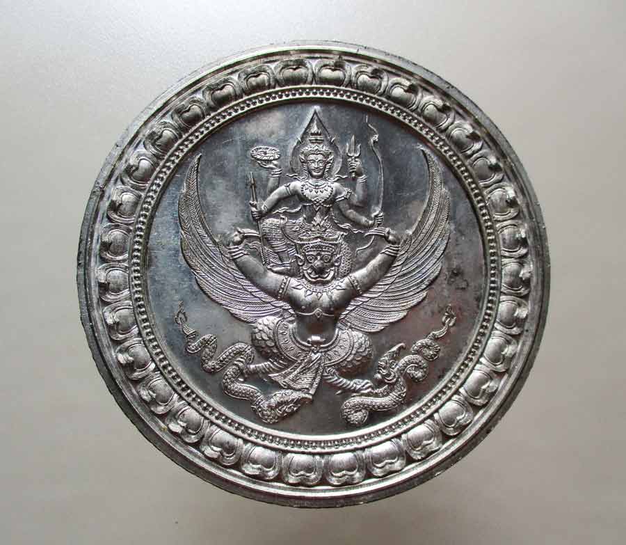 เหรียญบาตรน้ำมนต์เทวาพิทักษ์ หลวงปู่เผือก วัดสาลีโข พิมพ์หลังนารายณ์ขี่ครุฑ พุทธอุทยานธรรมโกศล จ.ปทุมธานี พ.ศ.2534 เนื้อชินเงิน สภาพสวย !!