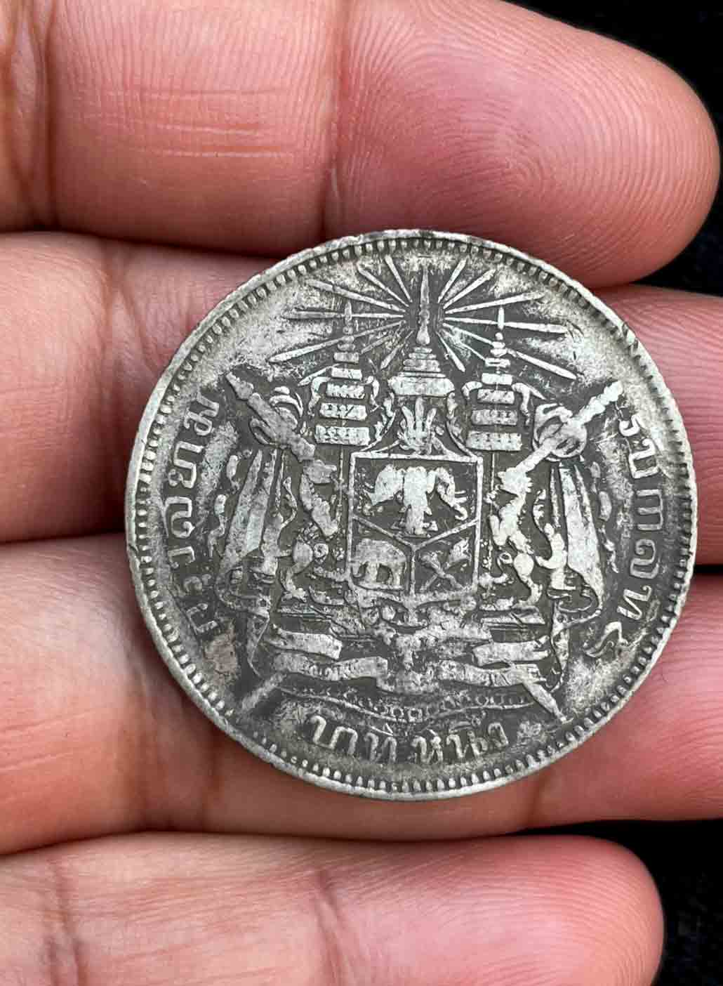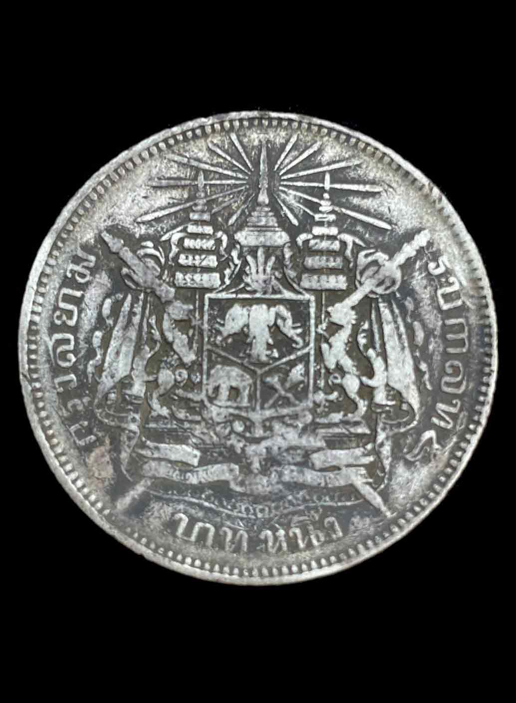 เหรียญเงิน บาทหนึ่ง รัชกาลที่ 5 หลังตราแผ่นดิน เนื้อเงิน น้ำหนัก 15 กรัม