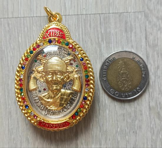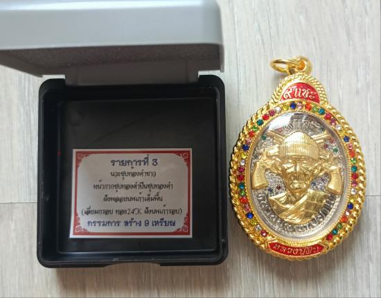 วัดใจเคาะเดียวแดงจ้า เหรียญ9แซะหลวงปู่ฝั้น วัดศรีภมอรัตน์ เนื้อนวะชุบทองคำขาวหน้ากากชุบทองคำ ฝังพลอยนพเก้าเต็มพื้น กรอบทอง24Kฝังพลอยนพเก้ารอบ หมายเลข7 เคาะเดียวแดงจ้า