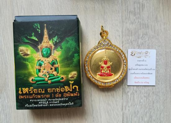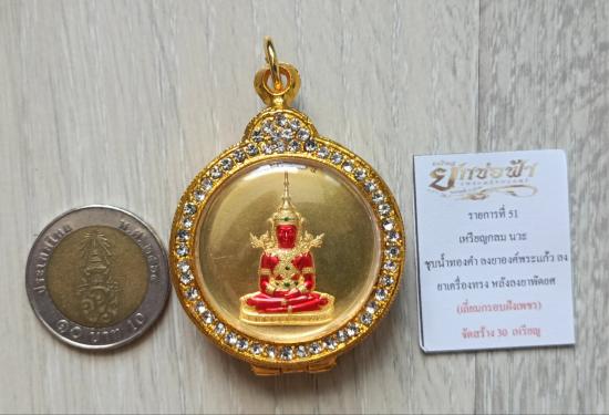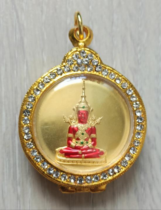 ชื่อพระเครื่อง วัดใจเคาะเดียวแดงจ้า เหรียญพระแก้วมรกต ออกวัดท้ายน้ำ เนื้อนวะชุบน้ำทองคำลงยาพระแก้ว พร้อมตลับชุบทองอิตาลีฝังเพชร เคาะเดียวแดงจ้า