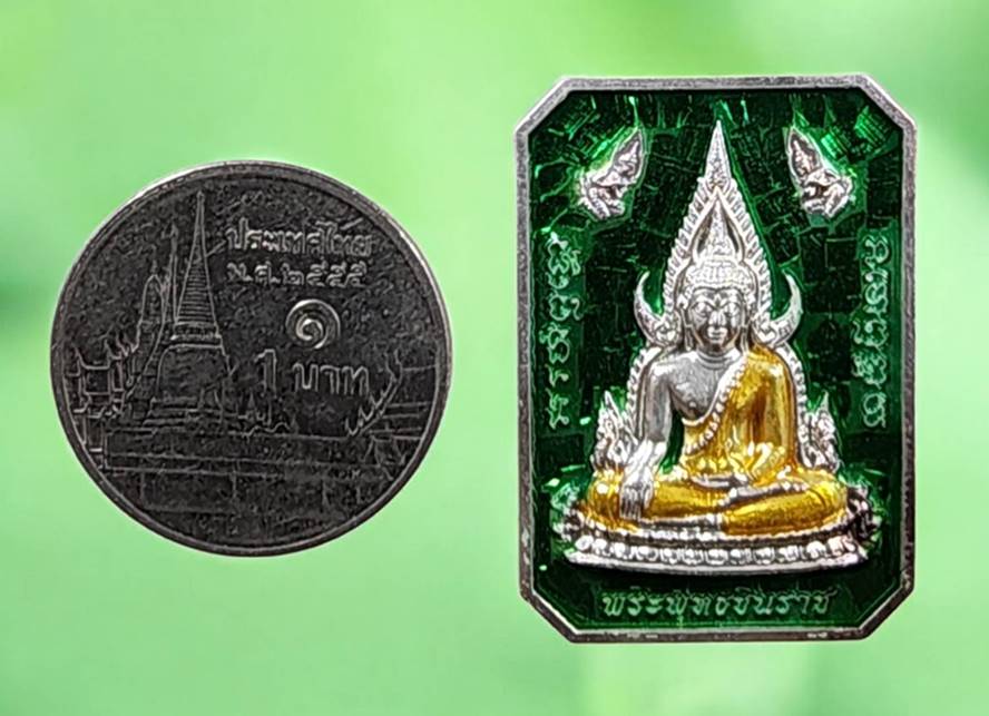 เหรียญแปดเหลี่ยม พระพุทธชินราชหลังพระนเรศวร รุ่นมหาราช 118 ปีเนื้อเงินลงยา(สีเขียว) หมายเลข 129 สภาพสวยมากๆ ครับ