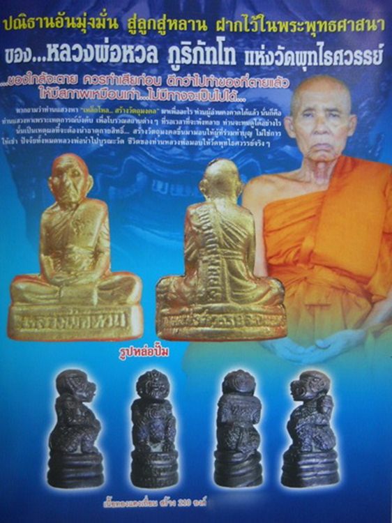 รูปเหมือนปั๊มหลวงพ่อหวล วัดพุทไธศวรรย์ เนื้อทองระฆังโบราณ(ชุบกะไหล่ทอง) จำนวนการจัดสร้างน้อย 4,999 องค์ จัดสร้างเนื่องใน วาระที่ หลวงพ่อหวล ท่านได้รับการแต่งตั้งเลื่อนสมณศักดิ์ที่ พระพุทไธศวรรย์วรคุณ เมื่อวันที่ 5 ธันวาคม 2551 ทางคณะศิษย์จึงใด้ขออนุญาตในการจัดสร้างวัตถุมงคล รุ่นเลื่อนสมณศักดิ์ ขึ้นโดยได้รวบรวมตะกรุดเก่าๆ ของหลายคณาจารย์ ของจังหวัดพระนครศรีอยุธยา พระปรุหนังและพระเนื้อชินที่ชำรุด ระฆังเก่าอายุหลายร้อยปี รวมทั้งเศษแร่ที่เหลือจาการสร้างวัตถุมงคลรุ่นก่อนๆ ของหลวงพ่อมาหลอม เพื่อเป็นชนวนในการสร้างรูปหล่อ รุ่นลื่อนสมณศักดิ์ และหลวงพ่อได้เมตตาอธิฐานจิตปลุกเสก ให้เมื่อวันที่ 23 กุมภาพันธ์ 52 จัดเป็นวัตถุมงคลของหลวงพ่อที่น่าบูชาครับ