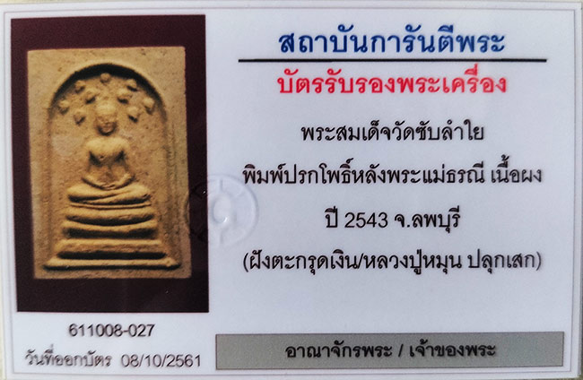 พระสมเด็จวัดซับลำใย พิมพ์ปรกโพธิ์หลังพระแม่ธรณี หลวงปู่หมุน ปลุกเสก เนื้อผง ปี 2543 จ.ลพบุรี ( ฝังตะกรุดเงิน2ดอก หายาก สร้างน้อย ) สภาพสวย พร้อมบัตรรับรอง ### 027 ###