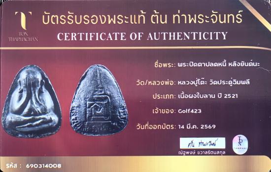 พระปิดตาปลดหนี้หลังยันต์นะ หลวงปู่โต๊ะ วัดประดู่ฉิมพลี บล็อกแรก ปี 2521-2523 เนื้อผงใบลาน บล็อคแรก บรรจุตะกรุดเงิน 1 ดอก + กรอบทองแท้ + บัตรรับรองพระแท้พ่นท่าพระจันทร์
