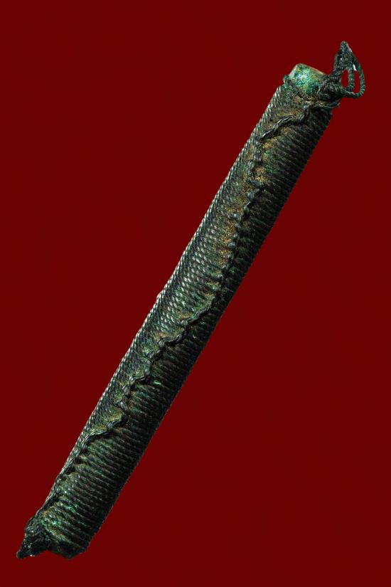ตะกรุดทองแดง ถักเชือกดำ ขนาด 3 นิ้ว เก่า |