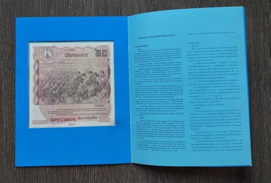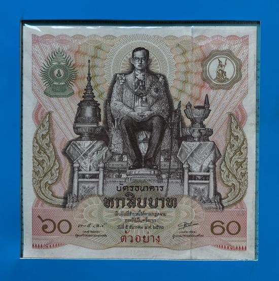 รายละเอียด ธนบัตรตัวอย่าง บัตรธนาคาร 60 บาท ที่ระลึกพระบาทสมเด็จพระเจ้าอยู่หัว รัชกาลที่ 9 เฉลิมพระชนมพรรษาครบ 5 รอบ พร้อมปก