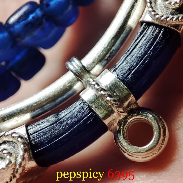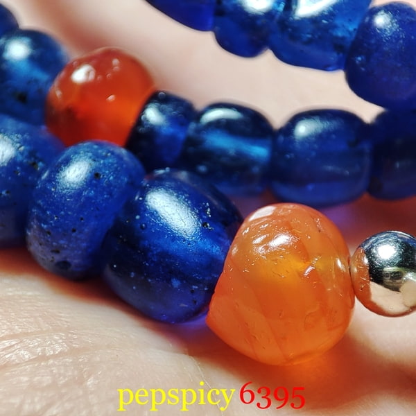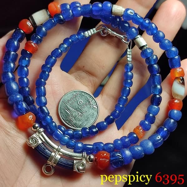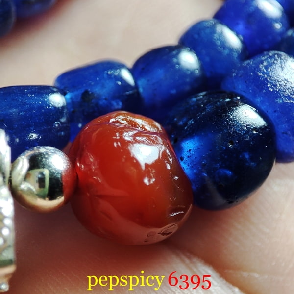 *เคาะแรกแดง* สร้อยลูกปัดแก้วโบราณยุคทวารวดีอายุกว่าพันปี คัดโทนสีน้ำเงินกษัตริย์ ร้อยประดับลูกปัดโบราณหินส้มคาร์เนเลียน หินอาเกต พร้อมคานห้อยพระชิ้นส่วนกำไลเนื้อลูกปัดแก้วโบราณจับเงินแท้สวยงามพร้อมใช้
