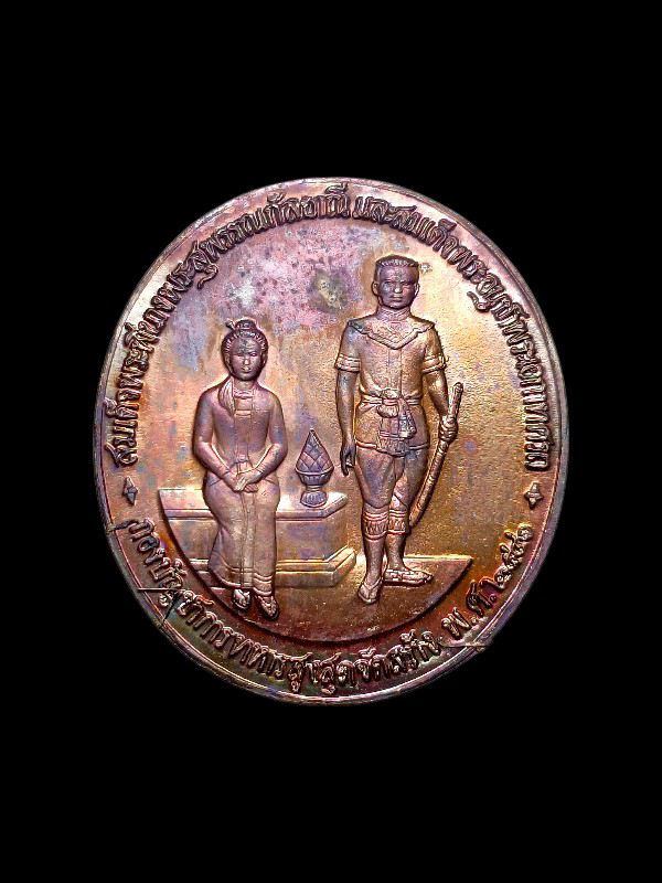 เหรียญสมเด็จพระนเรศวรมหาราช หลังสมเด็จพระพี่นางสุพรรณกัลยานี และสมเด็จพระอนุชาพระเอกาทศรถ ที่ระลึกในงานก่อสร้างพระบรมราชานุสาวรีย์ กองบัญชาการทหารสูงสุด จัดสร้างปี 2541 |