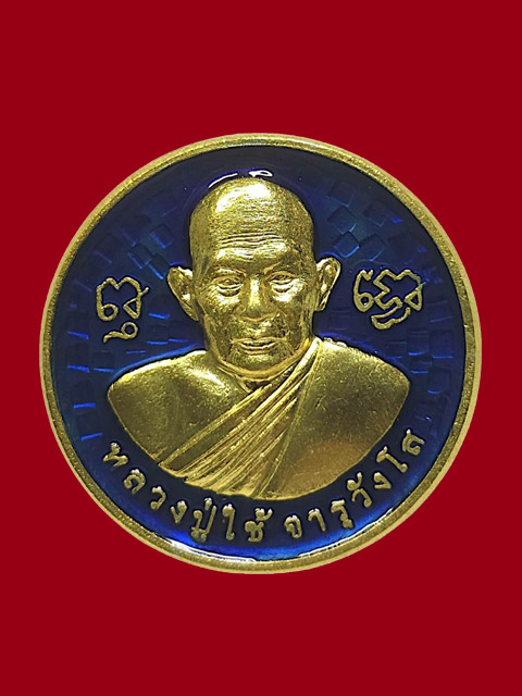 ***เหรียญพระคุณของแม่ เนื้อทองแดงชุบทองลงยาสีน้ำเงิน (ขนาดเท ่าเหรียญ 2 บาท) หลวงปู่ใช้ จารุวังโส) วัดคชสารมุนีษร๊ ฯ จ.ปร า จีนบุรี*** สร้าง 199 เหรียญ