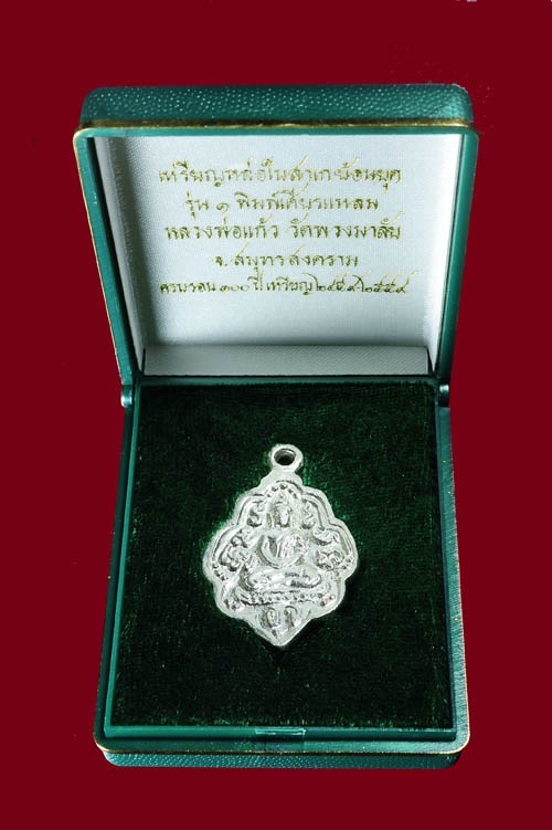 เหรียญหล่อใบสาเกย้อนยุค เนื้อเงิน พิมพ์เศียรแหลม หลวงพ่อแก้ว วัดพวงมาลัย จ.สมุทรสงคราม ออก ปี2559 ในงาน ครบรอบ 100 ปี เหรียญ