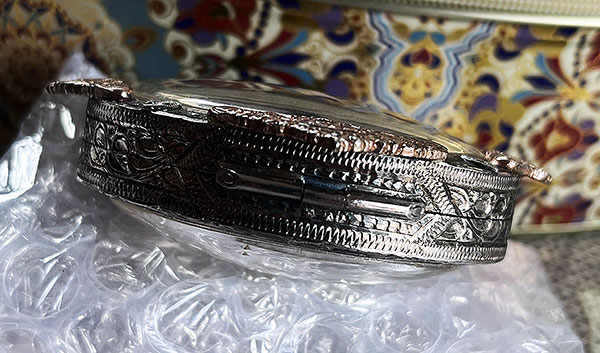 รายละเอียด ตลับเงินแท้มือสอง (งานสั่งทำ ) เงินลงยายกซุ้มราหู 4 มุม ( ราหูชุบนาค ) น้ำหนัก 35.7 กรัม