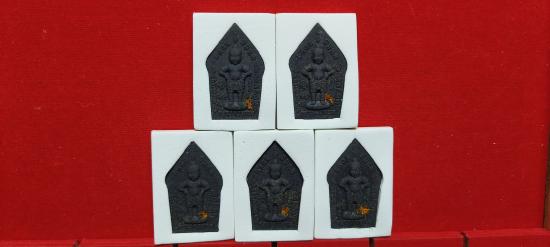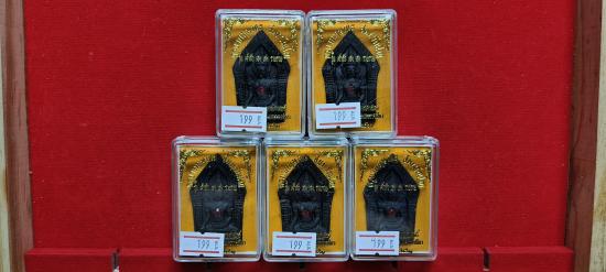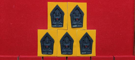 แบ่งปัน พระผงขุนแผน รุ่นเจ้าสัวเฮงเฮงรวยรวย ครูบากฤษณะ อินทฺวัณโณ ปี 2561 เนื้อผงพุทธคุณสีดำ ฝังพลอยแดง ตะกรุดเงินคู่ ด้านหลังฝังจีวรผงตะไบ ชุด 5 องค์ ประกันแท้