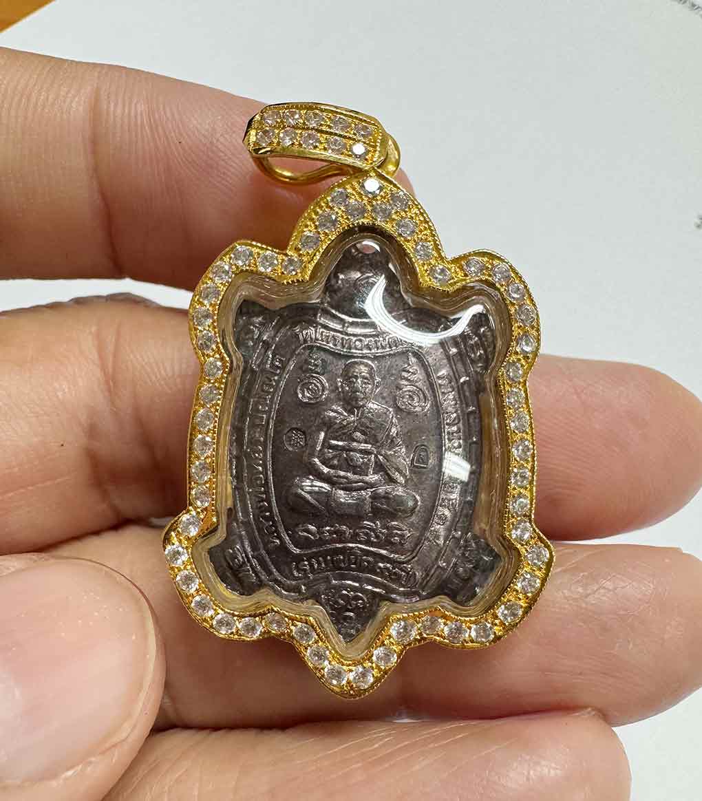 **เหรียญพญาเต่าเรือน หลวงปู่หลิว วัดไทรทอง รุ่นแซยิด 90 ปี สร้างปี พ.ศ.2539 เนื้อเงิน ตอก 2 โค้ด โค้ด ลก(ภาษาจีน) และโค้ด ล. หายาก เลี่ยมทองคำแท้ ตอกโค๊ต80% ฝังเพชรCZ งานสวยเนียบ+พระผิวเดิมห่วงพระเดิมยังอยู่ แทบไม่ผ่านการใช้**