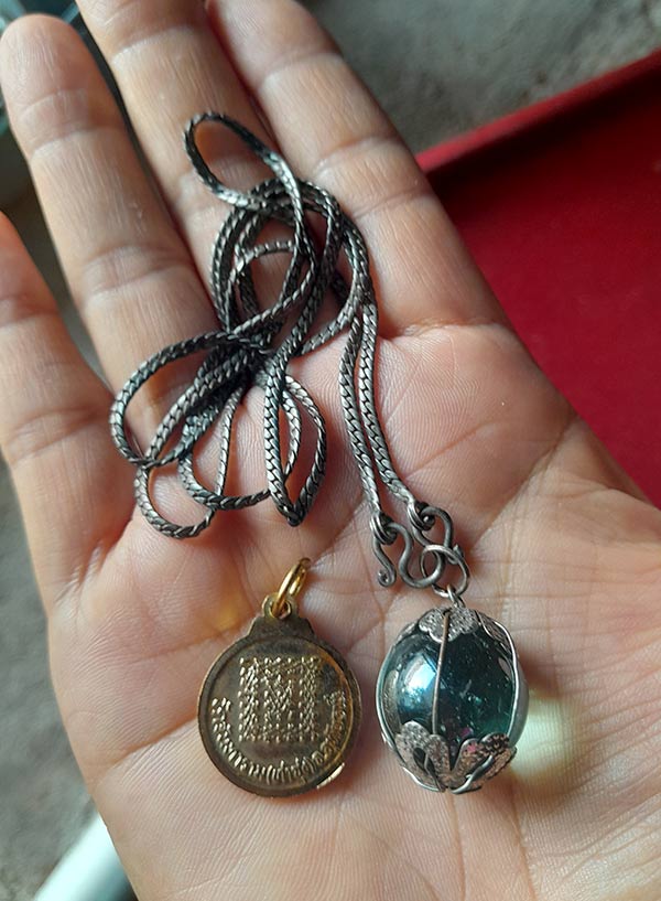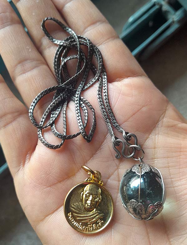 สร้อยเงินพร้อมลูกแก้วสารพัดนึก + เหรียญหลวงพ่อฤาษีลิงดำ วัดท่าซุง