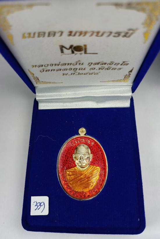 เหรียญ เมตตามหาบารมี หลวงพ่อหวั่น วัดคลองคูณ ปี2558 เนื้อเงิน 2 หน้า ลงยาขุ้ยพื้นสีแดง(ห่มคลุม)/เขียว(ห่มเฉียง) (แยกชุดกรรมการใหญ่) เบอร์ 339 พร้อมกล่องครับ (น้ำหนักเหรียญ 19.49 กรัม)
