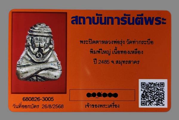 พระปิดตายันต์ยุ่ง รุ่นแรก หลวงพ่อรุ่ง วัดท่ากระบือ ปี 2485 เนื้อทองเหลือง พิมพ์ใหญ่ จ.สมุทรสาคร มาพร้อมบัตร G pra ...