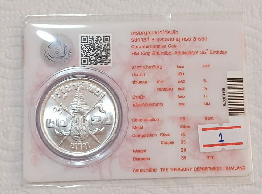 รายละเอียด เหรียญกษาปณ์ ชนิดราคา 20 บาท ในหลวงร.9 พระชนมายุครบ 3 รอบ ปี2506 ((( เนื้อเงิน ))) 3.5 ซม. หนัก 20 กรัม สภาพไม่ผ่านใช้ จำนวน 1 เหรียญ ครับ #1#