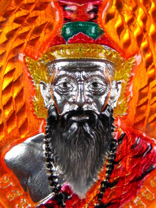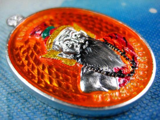 เหรียญฤาษีนารอด หลวงพี่เลี้ยง วัดจอมเกษ เนื้อชุบเงิน พื้นส้ม ลงยาองค์ฤาษี พร้อมกล่องเดิม(---A48---) |