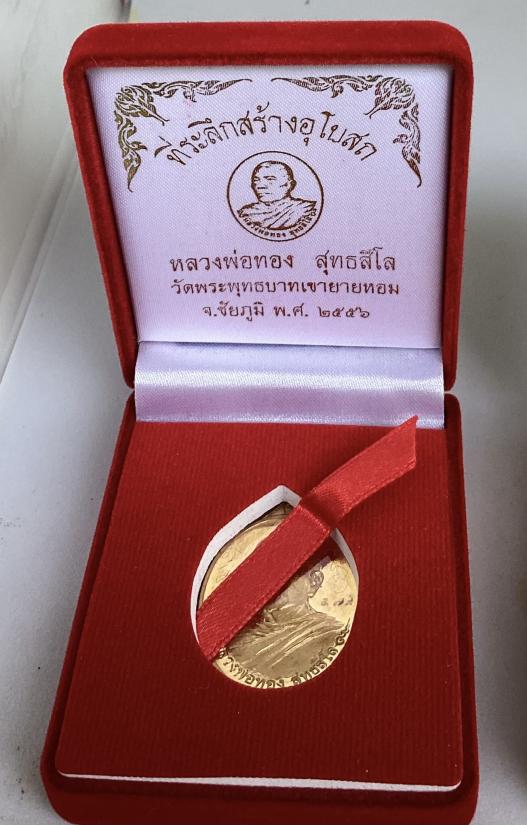 เหรียญหันข้าง รุ่นที่ระลึกสร้างอุโบสถ หลวงพ่อทอง สุทธสีโล วัดพระพุทธบาทเขายายหอม จ.ชัยภูมิ ปี2556 เนื้อสัตตะหลังแบบ แยกจากชุดกรรมการ หมายเลข 579 พร้อมกล่องครับ