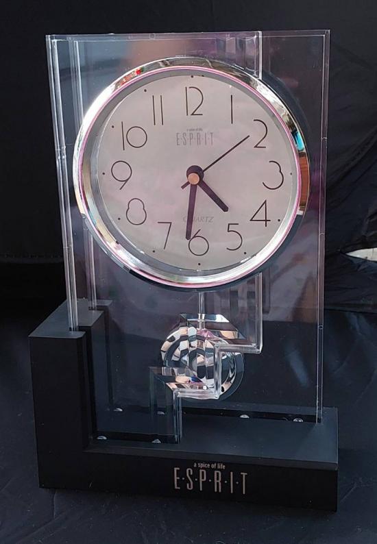 นาฬิกาตั้งโต๊ะของแบรนด์แฟชั่น ESPRIT ซึ่งเป็นรุ่นลิมิเต็ดอิดิชั่นที่มีตัวเรือนเป็นอะคริลิกใสและมาพร้อมกับลูกตุ้มแกว่ง โดยนาฬิกาประเภทนี้มักเป็นของสะสมที่ได้รับความนิยมสำหรับผู้ที่ชื่นชอบงานดีไซน์ยุค 90.