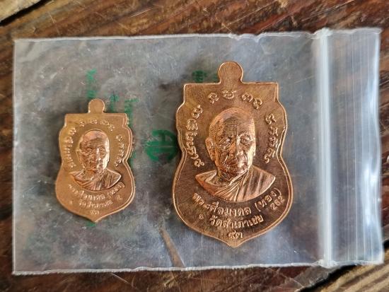 เหรียญจักรพรรดิ์ หลวงพ่อทวด-พระอาจารย์ทอง วัดสำเภาเชย รุ่น ทอง 93 เหรียญเสมา "ยิ่งเลื่อน ยิ่งโต" เนื้อทองแดงหน้ากากทองชุบ + เหรียญเสมาเลื่อน เล็ก ชุดกรรมการ