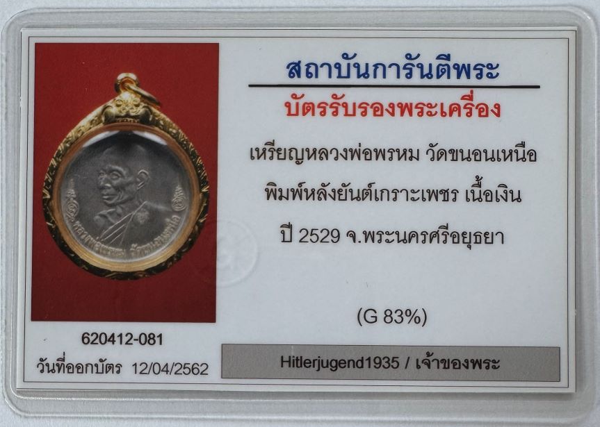 เหรียญยันต์เกราะเพชร หลวงพ่อพรหม วัดขนอนเหนือ เนื้อเงินมีจาร เลี่ยมทอง สร้างปี พ.ศ.2529 พร้อมบัตร g-pra
