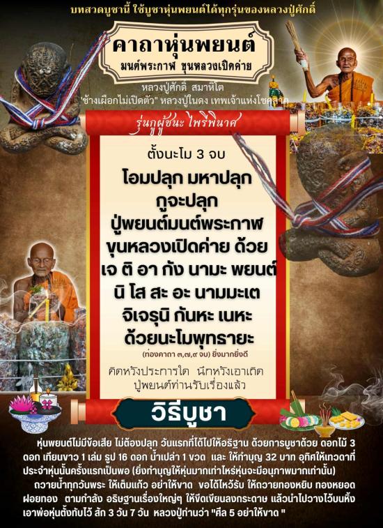 หลวงปู่ ท่านบอก ให้พกไป ใหญ่คับที่ คนเกรงใจ ไปไหนผ่านสะดวก มีชัย มีกำไลตลอดทาง ลูกหลานเอ่ย บูชาไว้เทิด หุ่นพ์ยฺนต์หลวงปู่สร้างให้ใช้ ไม่มีพิษ ไม่มีภัยต่อคนบูชา ไว้คุ้มครองตน ครอบครัว รถยนต์ บ้านเรือน..