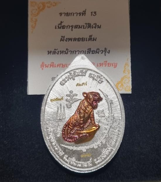 -รก.13 กรุสมบัติเงิน ฝังพลอยเต็ม หลังหน้ากากเสือผิวรุ้ง (เลข 132 เลขสวยๆ เลขมีความอุดมสมบูรณ์ มักได้รับผลประโยชน์ โชคลาภ หรือการสนับสนุนจากผู้อื่นอยู่เสมอ) พร้อมกล่อง