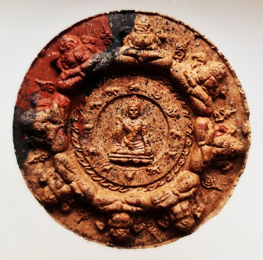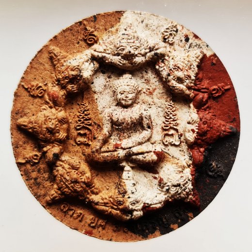 องค์จตุคามรามเทพ รุ่นเงินไหลมา รุ่นแรก วัดพระธาตุ จ.นครศรีธรรมราช ลาภ ยศ สรรเสริญ สุข พิมพ์ใหญ่ เนื้อก้นครก หน้าพระพุทธสิหิงค์ หลังองค์พ่อจตุคามรามเทพ ล้อมด้วยปิดตาพังพระกาฬ ขนาด 5 ซ.ม สภาพสวยเก็บเดิม ๆ (ไม่มีกล่อง)