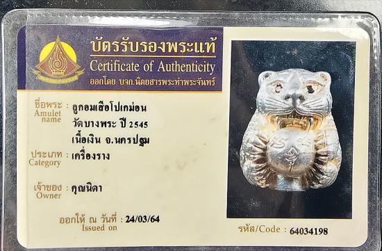 เสือโปเกมอน หลวงพ่อเปิ่น วัดบางพระ 2545 พร้อมใบรับรอง เนื้อเงิน น่าสะสม
