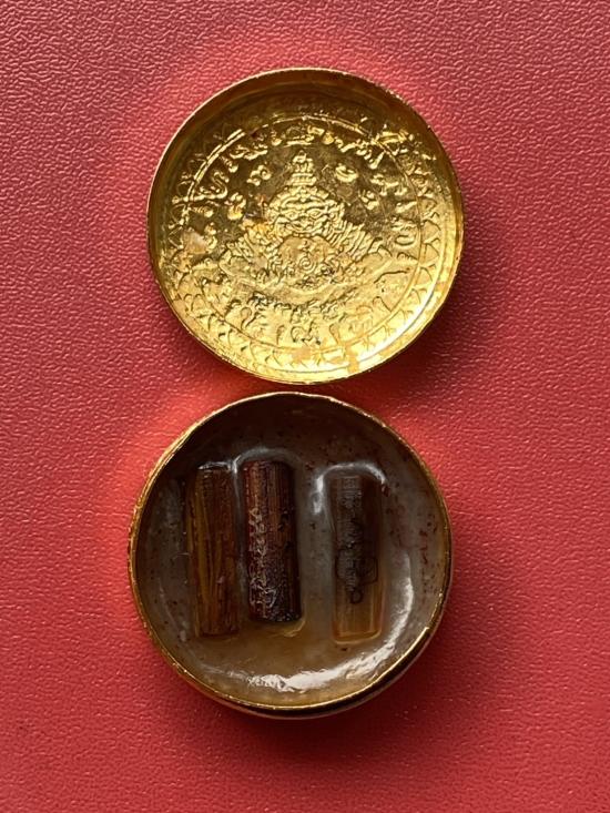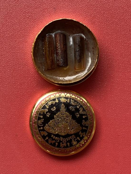 เคาะเดียวแดง สีผึ้งพระราหู รุ่น มงคลจักรวาล เนื้อ โลหะชุบทองลงยาสีดำขอบสีแดง ขนาด3.2ซม |