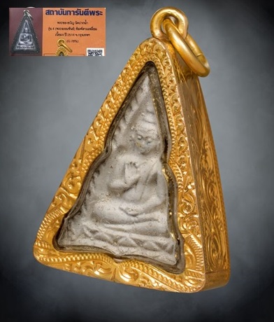 พระผงของขวัญ วัดปากน้ำ จ.กรุงเทพฯ รุ่น 4 พิมพ์สามเหลี่ยม สร้างปี2514 พร้อมเลี่ยมกรอบทองคำแท้หนาๆ 78% (น้ำหนักพระรวมทอง8.16กรัม)มาบัตรการันตีพระแท้แน่นอนครับท่าน