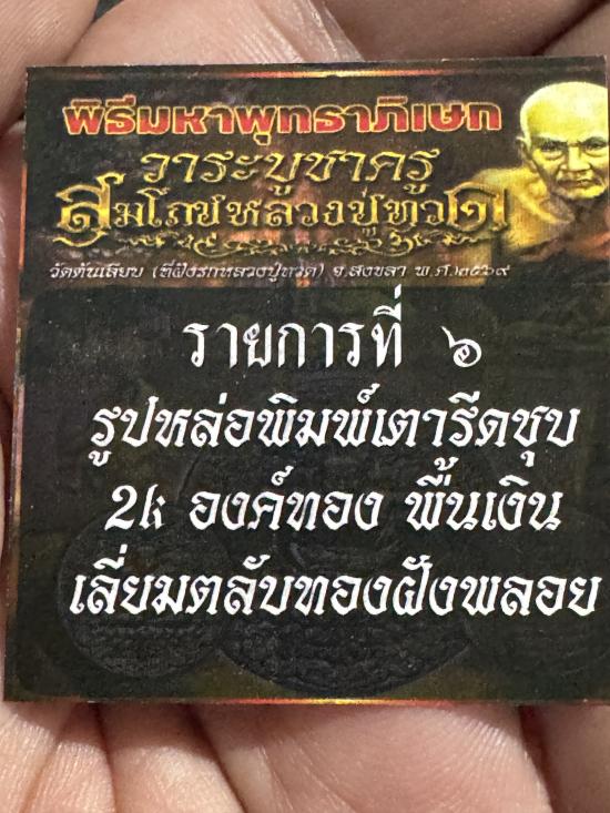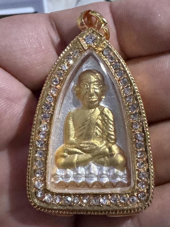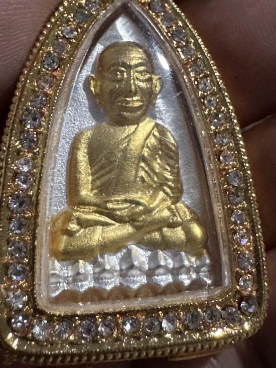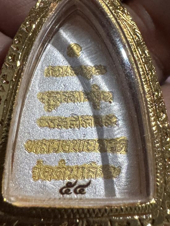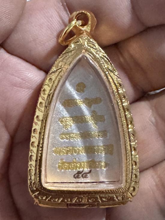 หลวงปู่ทวด พิมพ์เตารีดหลังตัวหนังสือ ชุบ 2K องค์ทอง พื้นเงิน เลี่ยมตลับทองฝังพลอย เลข 54 วัดต้นเลียบ สงชลา
