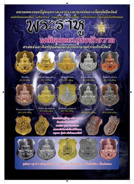 มหาเทพทรงฤทธิ์ ผู้หยุดกาลเวลา กุมดวงชะตามนุษย์โลก...พระราหู พลังอมตะแห่งจักรวาล...บูชาเพื่อความเจริญรุ่งเรืองในชีวิต บันดาลโชค กลับร้ายกลายดี แก้ปีชง หนุนดวงชะตา เสริมบารมี เพิ่มโชค เสริมทรัพย์...ด้วยพุทธศิลป์ที่เป็นเลิศ พุทธคุณเปี่ยมล้น 16 วาระและบวงสรวงณ ถ้ำฉัททันต์บรรพต วัดเขาอ้อ จ.พัทลุง มีเกจิคณาจารย์ผู้ทรงวิทยาคมทุกสายเมตตา อธิธฐานจิตให้เกจิสำนักวัดเขาอ้อเสกและร่างทรงมือ ลป.ทวดก็เสกชุดนี้ด้วย"พ่อท่านพล วัดนาประดู่"ลพ.เขียว วัดห้วยเงาะ ท่านเจ้าคุณ มหาสุรศักดิ์พระอุปัชฌาย์อิฏฐ์ ภทฺทจาโร วัดจุฬามณี อ.ติ๋ว วัดมณีชลขันธ์และเกจิผู้ทรงวิทยาคมอีกหลายท่าน พระราหู