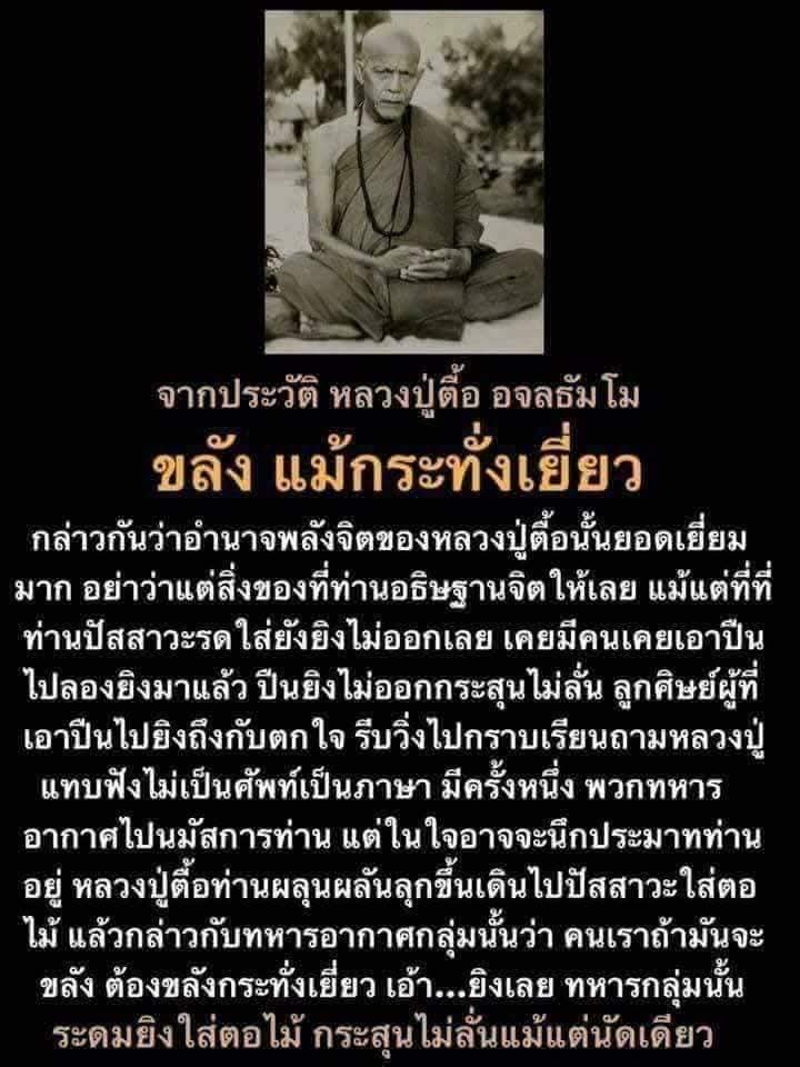 ประวัติหลวงปู่ตื้อ อจลธมฺโม วัดอรัญญวิเวก อำเภอศรีสงคราม จังหวัดสกลนคร ย่อ ท่านเป็นพระมหาเถระฝ่ายวิปัสสนากรรมฐานสายหลวงปู่มั่น ภูริทตฺโตเดิมนั้นท่านบวชในฝ่ายมหานิกาย เป็นสหธรรมิกของหลวงปู่แหวน สุจิณฺโณ ได้เที่ยวธุดงค์ ไปด้วยกันเป็นเวลานาน หลวงปู่เป็นผู้มีอุปนิสัยพูดจาแบบตรงไปตรงมา มีปฏิภาณไหวพริบเป็นยอด ได้ชื่อว่าเป็นผู้มีฤทธิ์อภิญญามากรูปหนึ่ง เป็นผู้เป็นที่รักของเทวดาและมนุษย์ทั้งหลาย เมื่อครั้งที่ท่านยังไม่ชราภาพท่านชอบเที่ยวธุดงค์อยู่ทางภาคเหนือ ภายหลังญาติโยมทาง นครพนมจึงมานิมนต์ท่านกลับไปจำพรรษาที่บ้านเกิด และท่านก็ได้มรณภาพที่บ้านเกิดของท่านเองในอิริยาบถนั่ง เทศนาบนธรรมาสน์ อัฐิท่านกลายเป็นพระธาตุและอัฐิธาตุไปแล้ว นั้นแสดงว่าท่านบริสุทธิ์ ในวัตรที่ปฏิษัติและบรรลุธรรมไปแล้ว