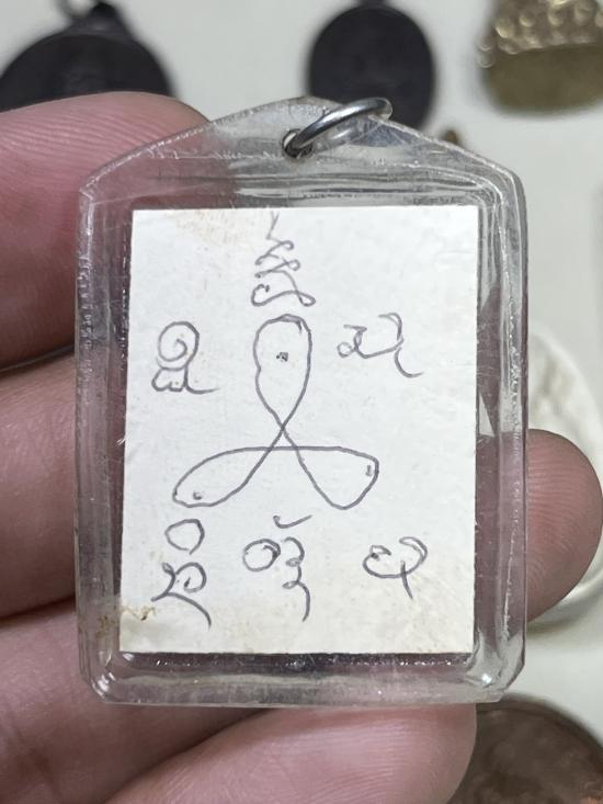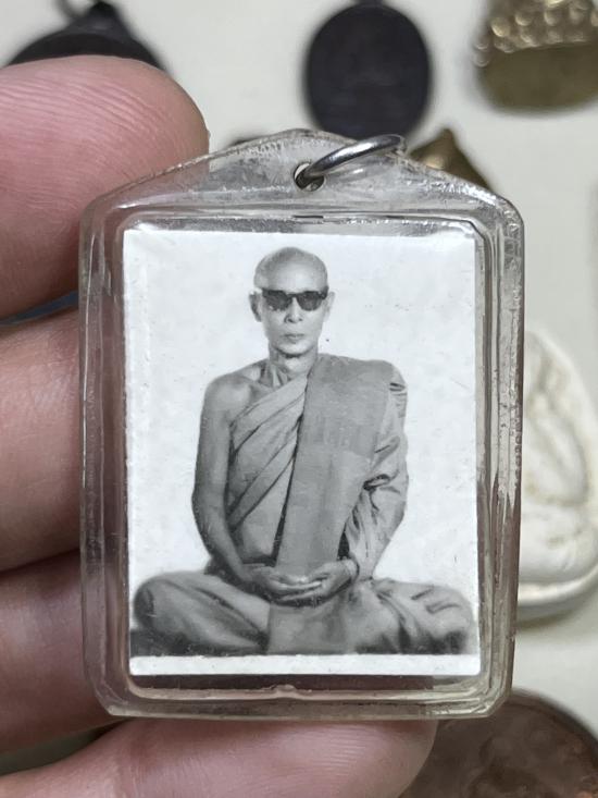 รูปถ่ายพระเกจิส่วมแว่นดำ หลังยันต์จารมือ เลี่ยมเก่า ไม่ทราบที่