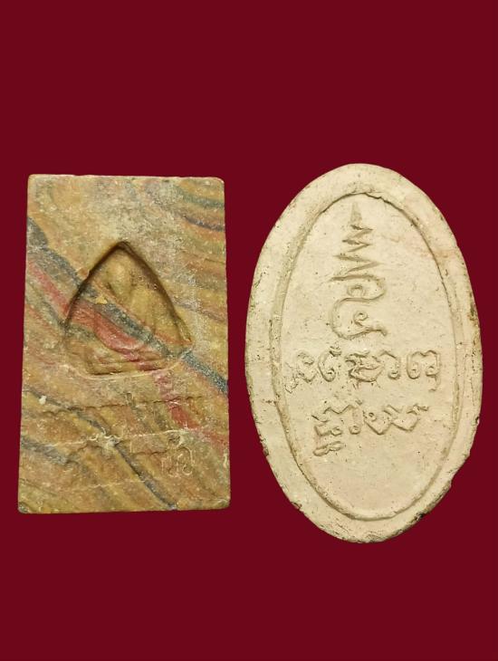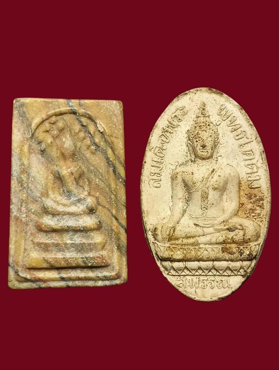 พระปรกโพธิ์ลายสายรุ้งหลังรูปเหมือน หลวงพ่อขอม วัดไผ่โรงวัว สุพรรณบุรี + พระพุทธโคดม ปี 2505 เนื้อดิน รวม 2 องค์ สวยครับ